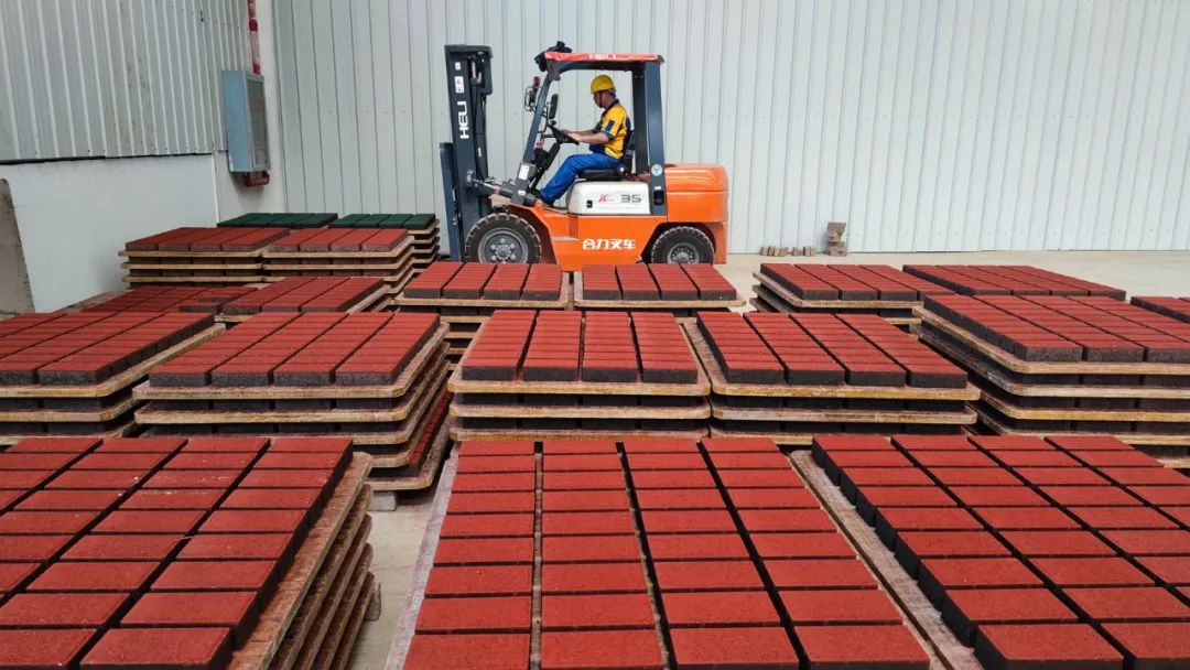 ▲圖解:工作人員正在搬運剛生產(chǎn)出爐的再生路面磚